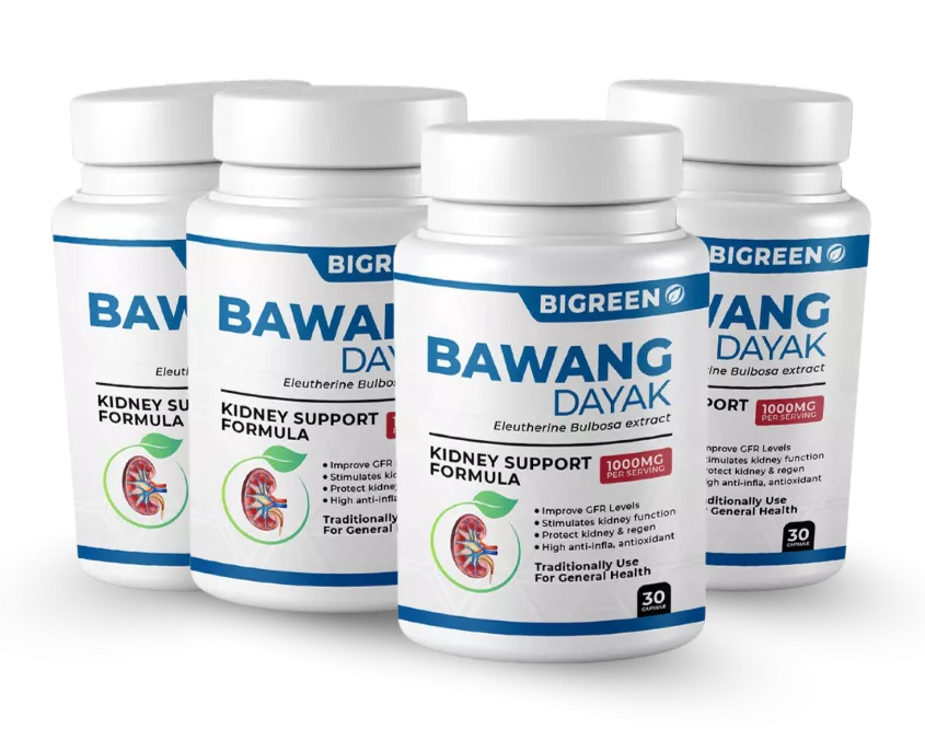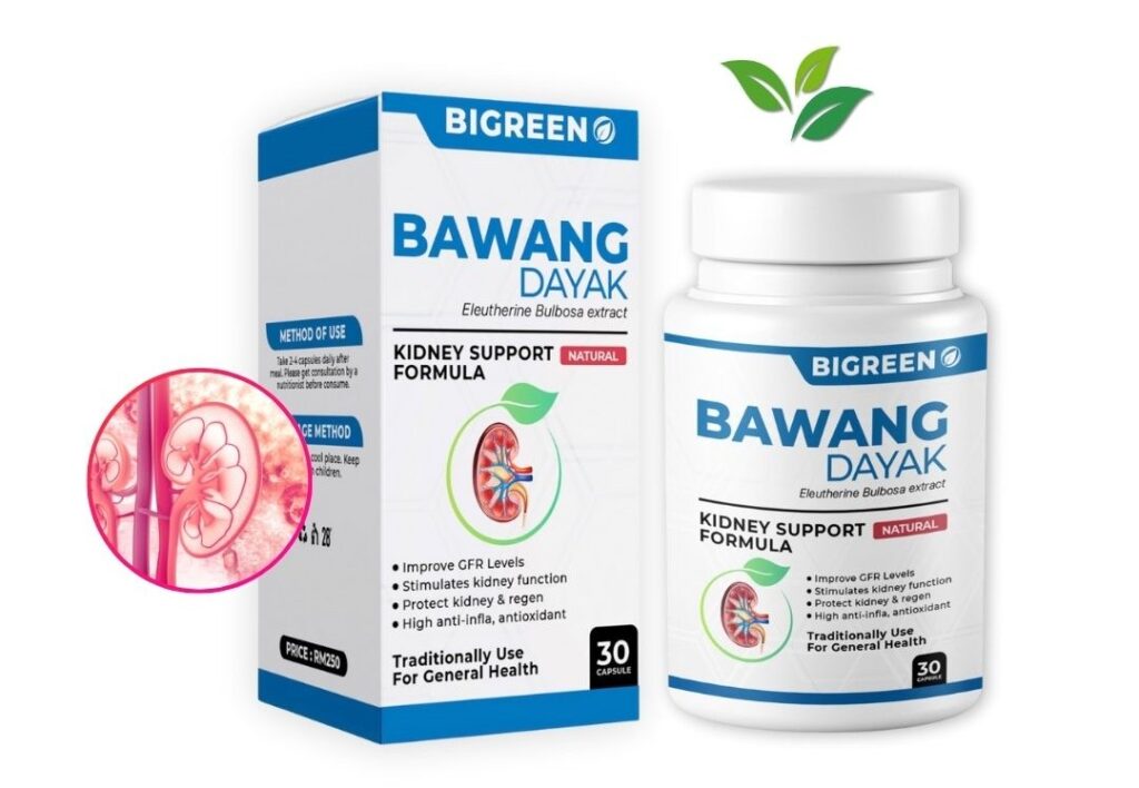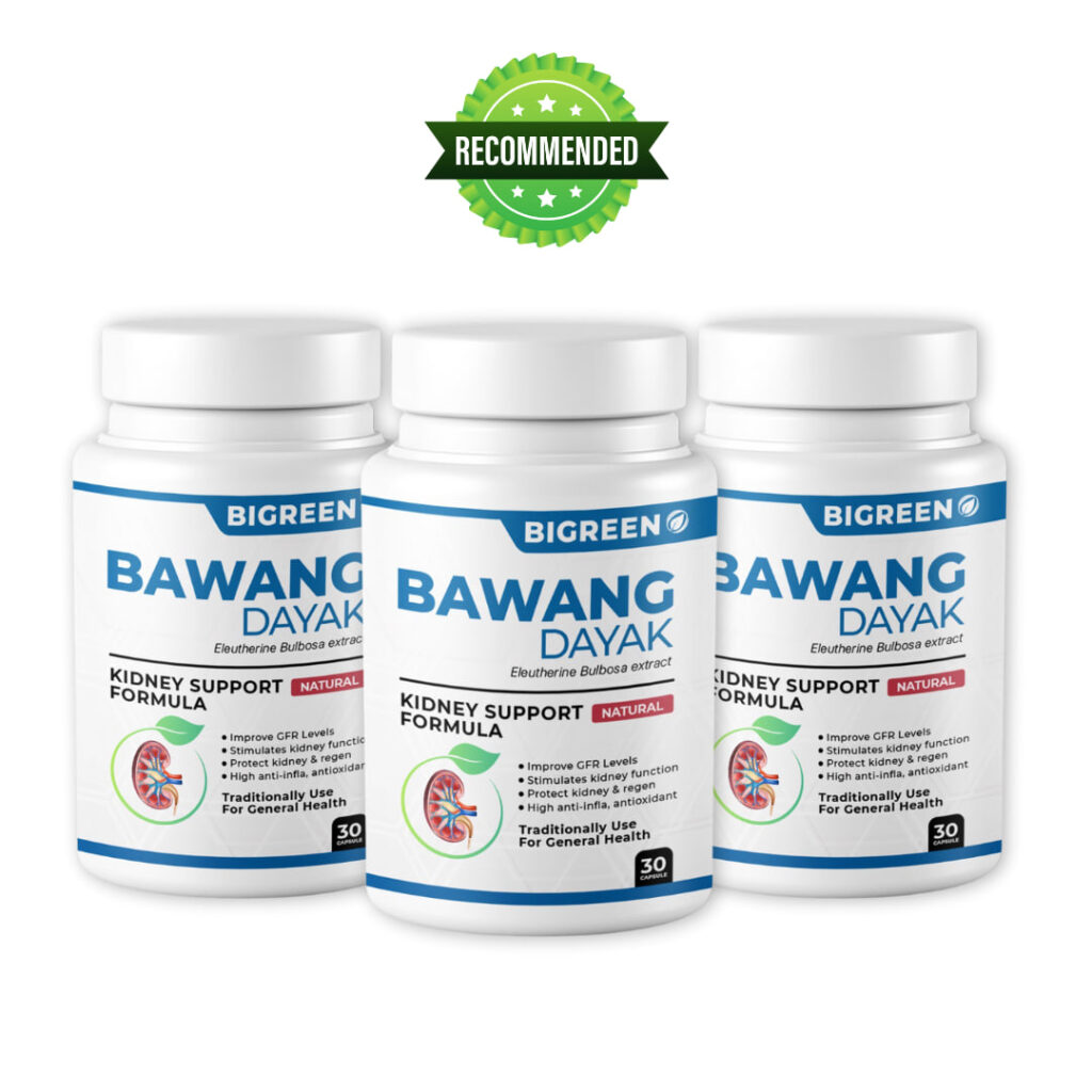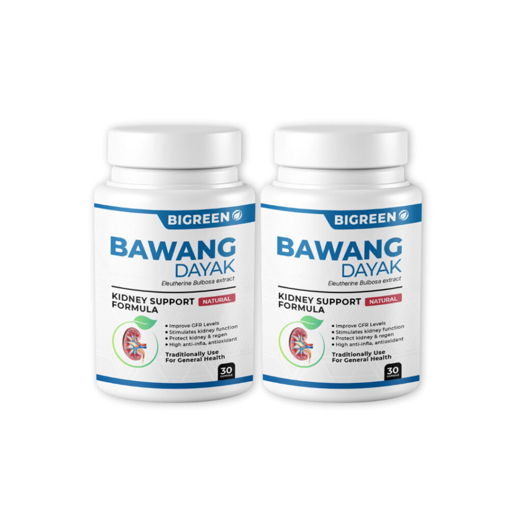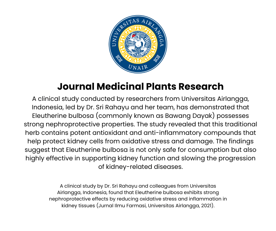 Bawang Dayak Kalimantan atau (Eleutherine Bulbosa) bersifat nephroprotective kerana mengandungi tanin, alkaloid dan antioksidan yang bantu meransang sel ginjal, kurangkan keradangan, dan stabilkan kadar kreatinin. Ia menyokong pemulihan buah pinggang secara semula jadi melalui detoksifikasi dan pengurangan tekanan oksidatif.