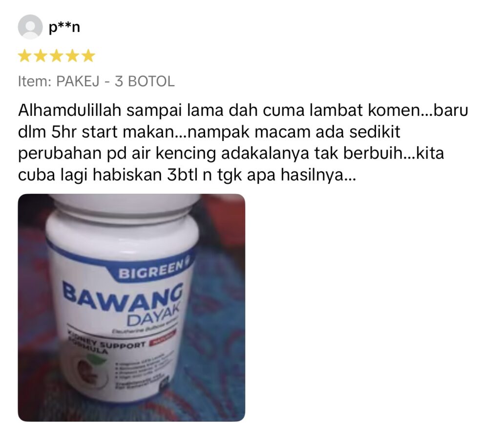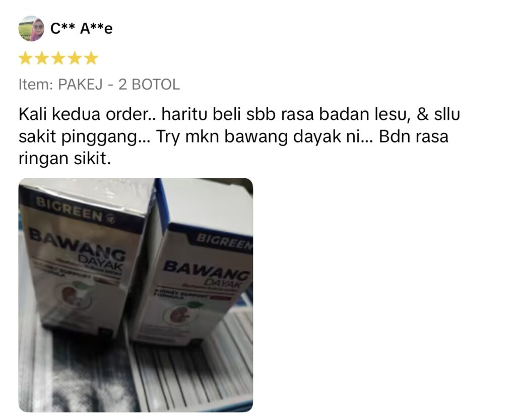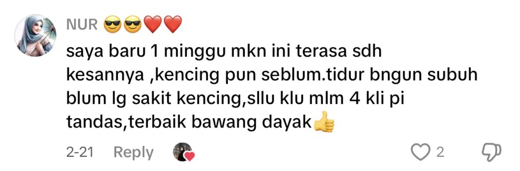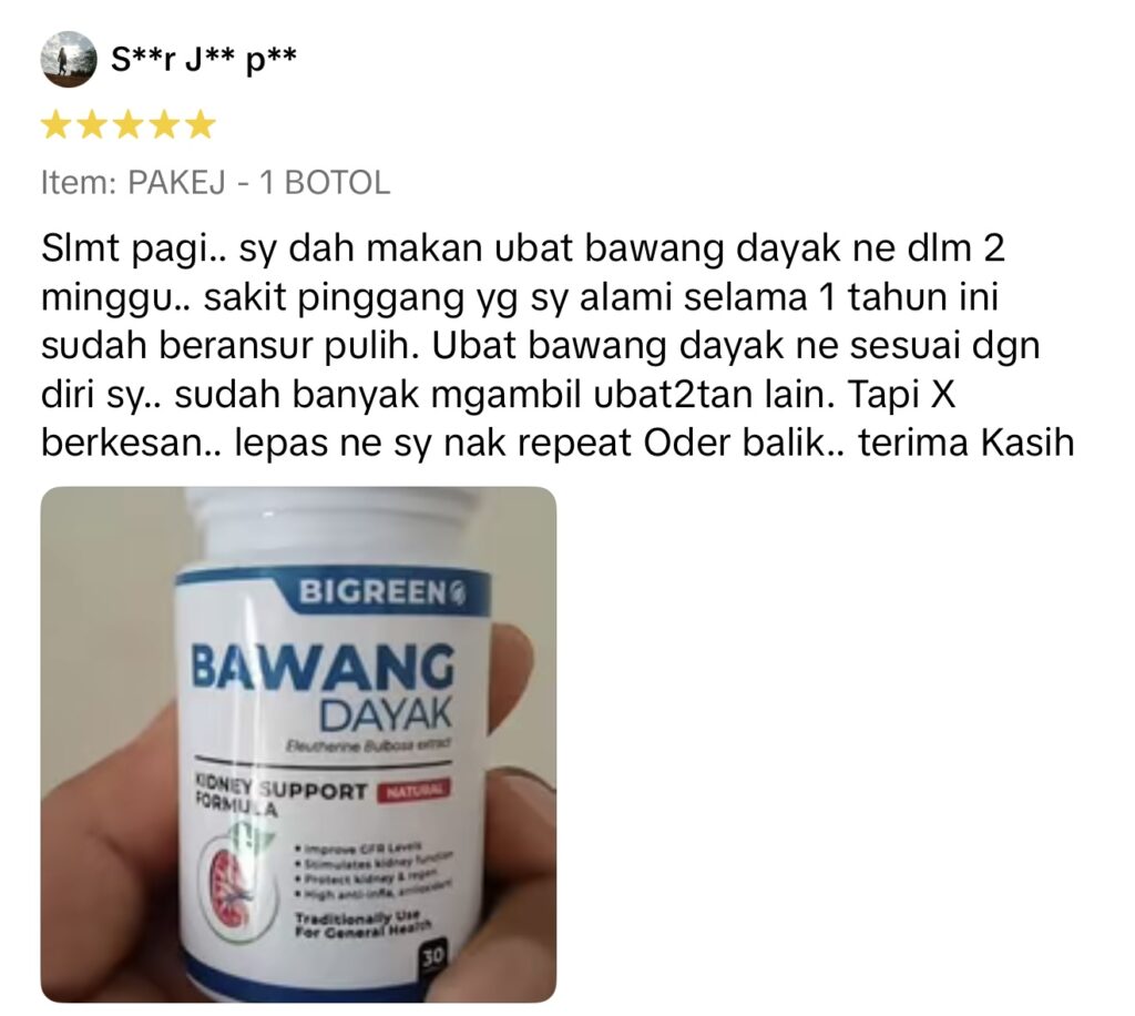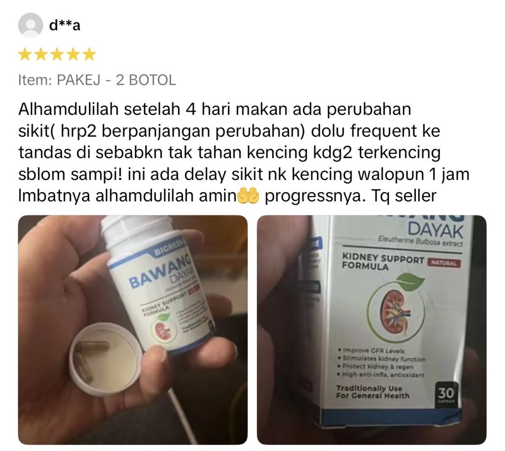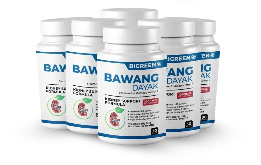 Bawang Dayak Kalimantan atau (Eleutherine Bulbosa) bersifat nephroprotective kerana mengandungi tanin, alkaloid dan antioksidan yang bantu meransang sel ginjal, kurangkan keradangan, dan stabilkan kadar kreatinin. Ia menyokong pemulihan buah pinggang secara semula jadi melalui detoksifikasi dan pengurangan tekanan oksidatif.
